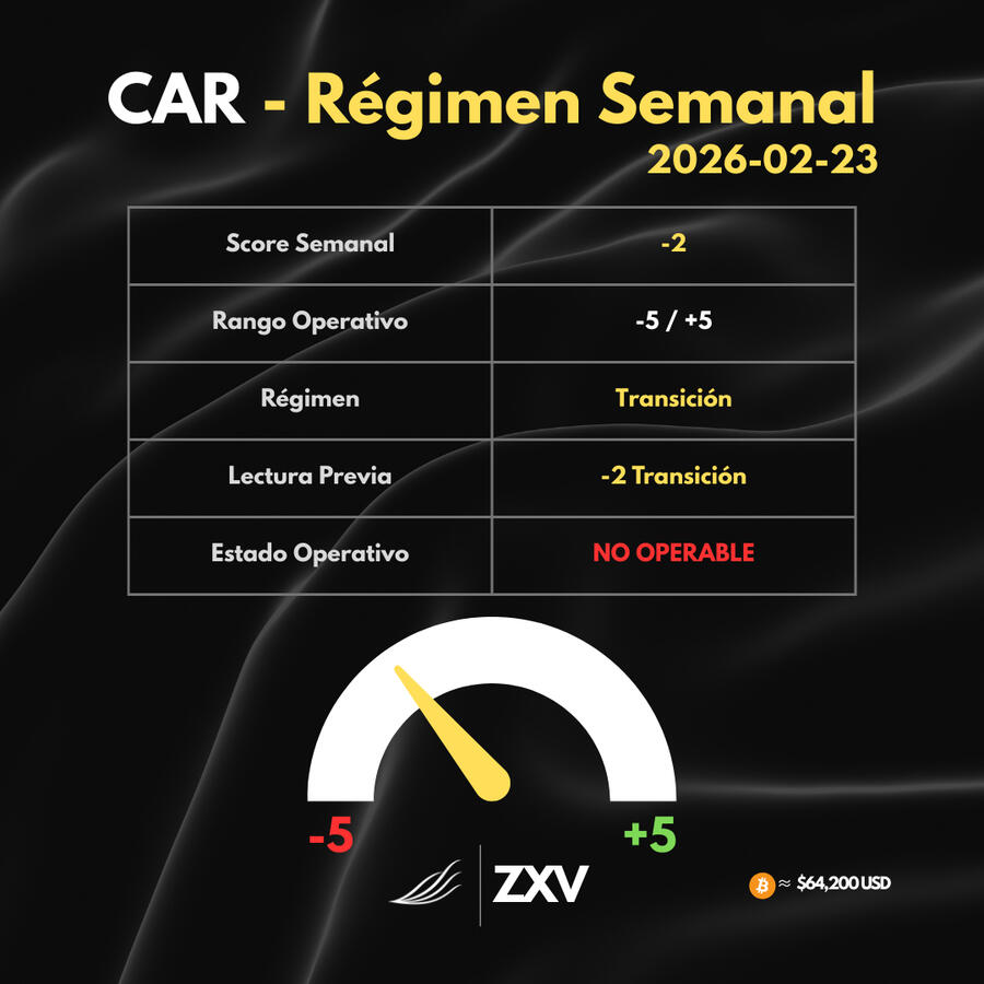 ZXV Finance es una iniciativa independiente de análisis macroeconómico y criptoactivos. El contenido publicado en este sitio, incluyendo reportes, clasificaciones de régimen, evaluaciones del Compás Adaptativo de Régimen (CAR) y cualquier material asociado, tiene fines exclusivamente informativos y educativos.Nada de lo aquí expuesto constituye asesoría financiera, recomendación de inversión, oferta de compra o venta de instrumentos financieros, ni gestión de activos para terceros. ZXV Finance no presta servicios de asesoramiento personalizado ni administra recursos de inversionistas.Los mercados financieros implican riesgos significativos, incluyendo la posible pérdida total del capital. Toda decisión de inversión es responsabilidad exclusiva del usuario.